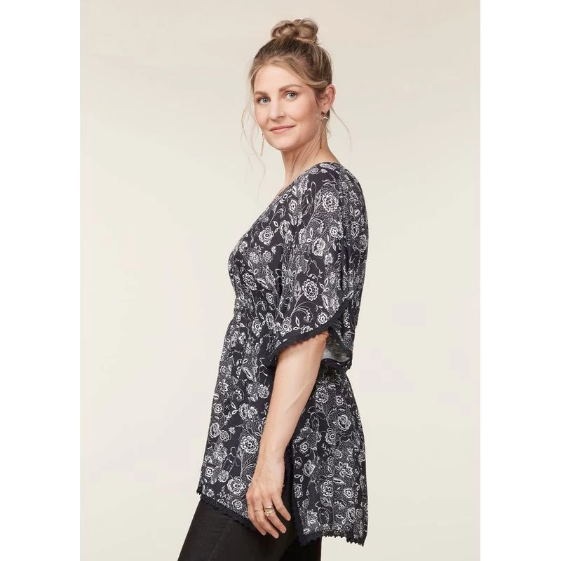 Float straight from your big client pitch to the kids’ piano recital in flutter sleeves that free you to applaud. An elongated silhouette features playful horse-inspired prints and drapes beautifully over a tank top. With gathers at the bust, a soft gauzy texture and delicate lace edging, this modern Boho pullover creates a flattering, feminine finish.