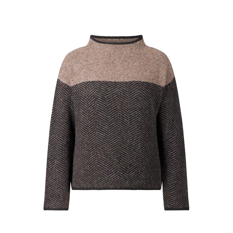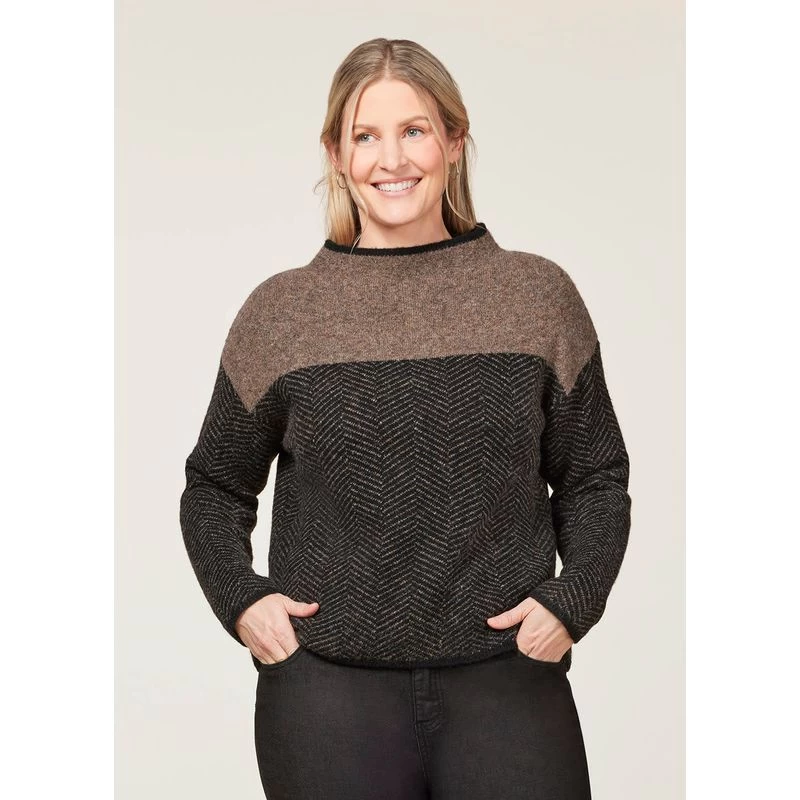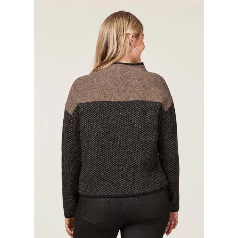 Earthy tones color blocked between solid and subtle pattern lend an ultra-flattering structure. Functionally fashionable funnel neck makes this relaxed fit sweater a multi-season staple.