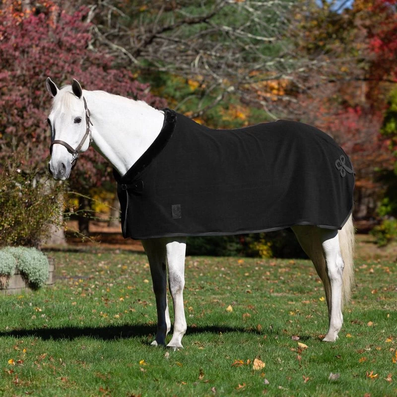 Made of premium 280gsm anti pill fleece, this cooler has a contoured fit to lay nicely around horses hind quarters. It is accented with leather like trim, and an decorative hip ornament with braided tail cord.