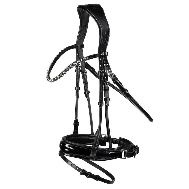 This bridle is made from genuine leather and is designed to be both attractive and comfortable. The ergonomic shaping and padding of the neck piece and noseband provides comfort and durability. The patent leather noseband and stainless steel fastenings add the final touch of polish. With pull-back closing and a detachable nose strap.