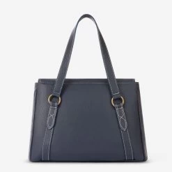 This gorgeous handbag is made of full grain pebbled leather. It has a signature saddle flap design with bridle stitching and brass or brushed nickel O ring details. The top is zippered for security and the lining is a classic hunt country plaid.