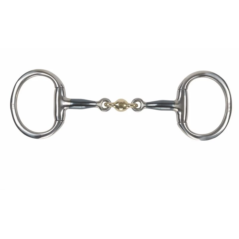 The fixed rings prevent pinching, whilst the brass alloy double joint distributes pressure over both the tongue and bars of the mouth to encourage mouthing and contact.